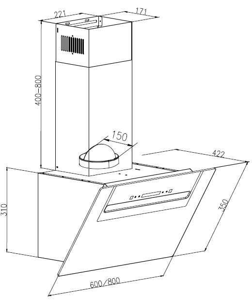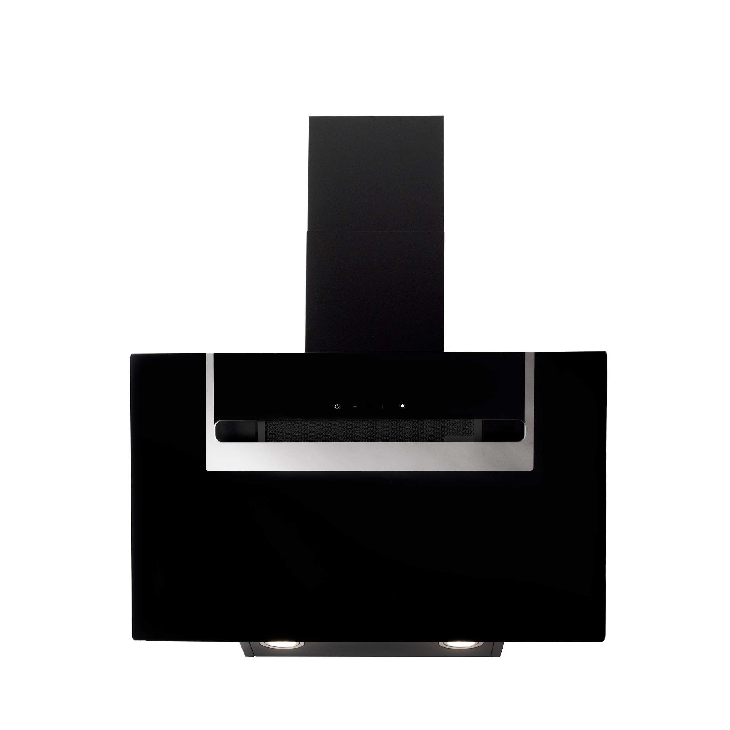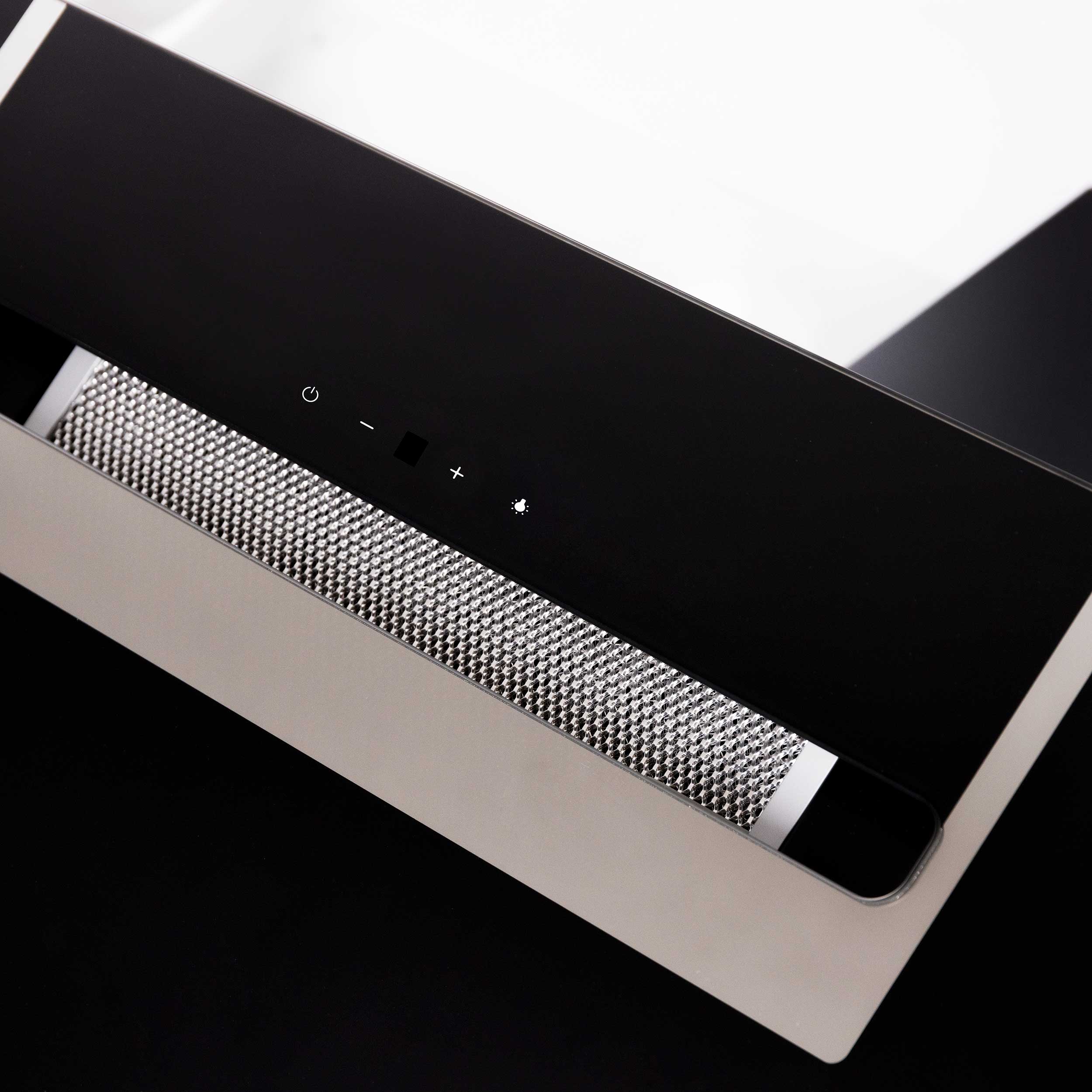Väggmonterad köksfläkt, vertikal. Med inbyggd motor - Svart glas/spegellist - 600mm - A++