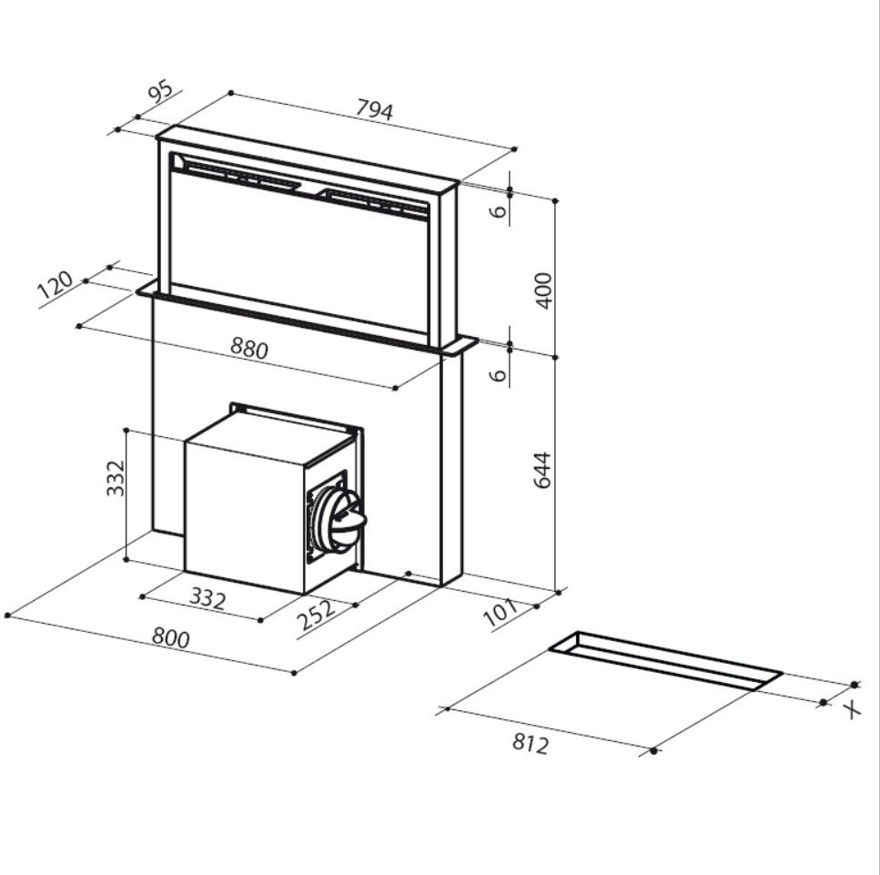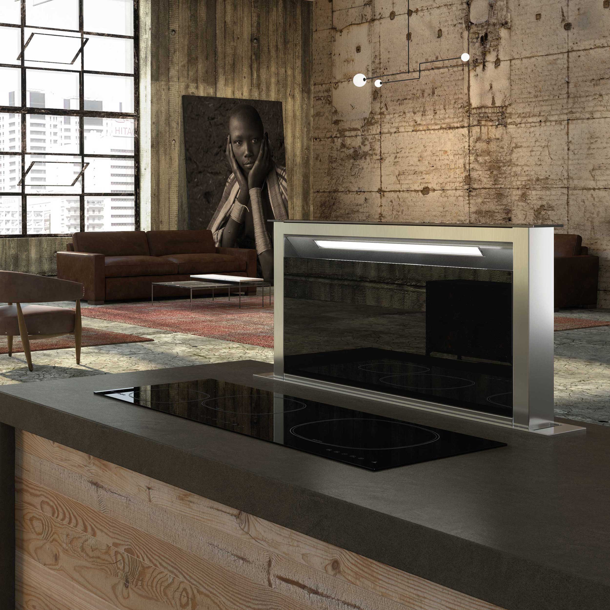 Köksfläkt för integrering i bänkskiva. Med inbyggd flyttbar motor - Rostfritt stål / svart glas - 880mm - A