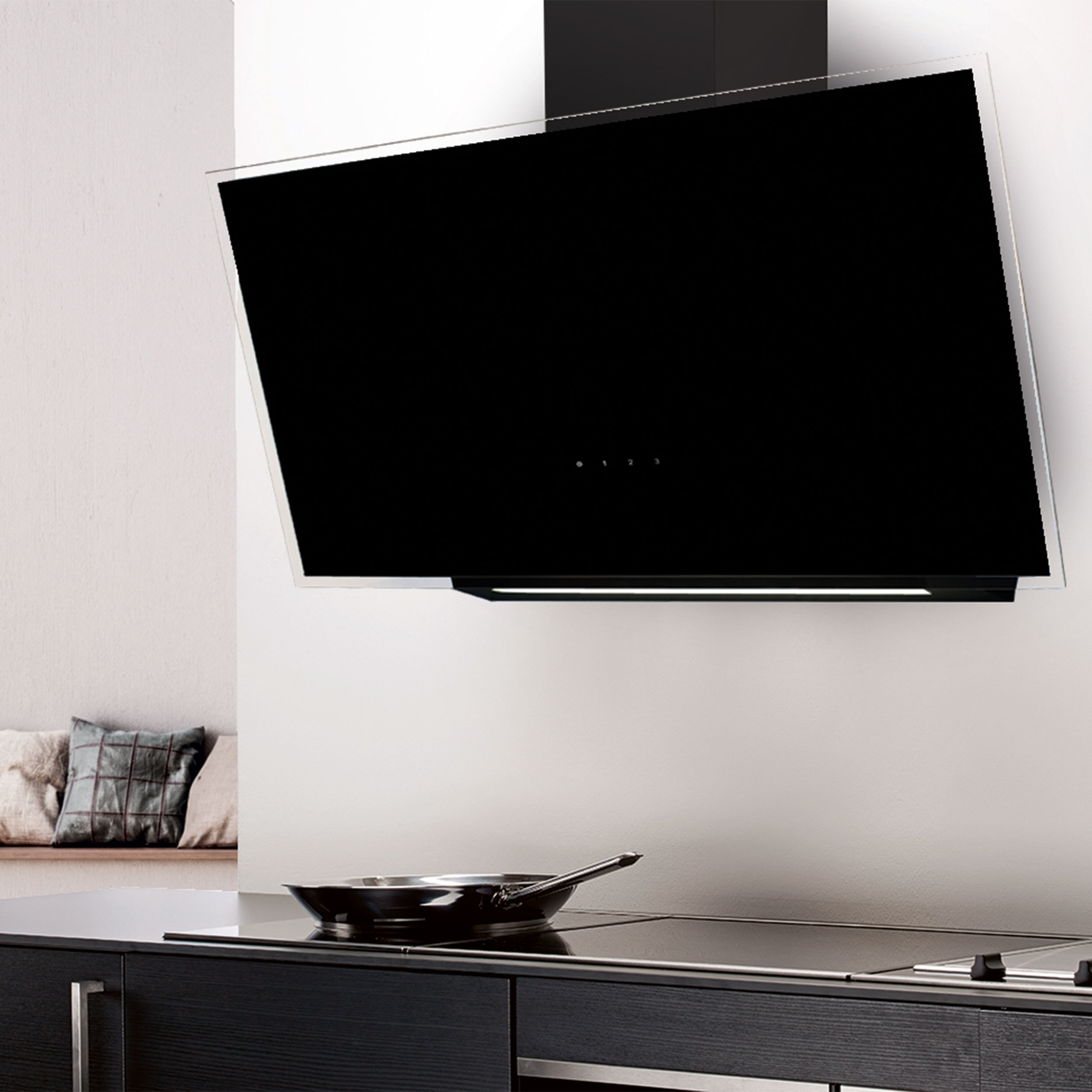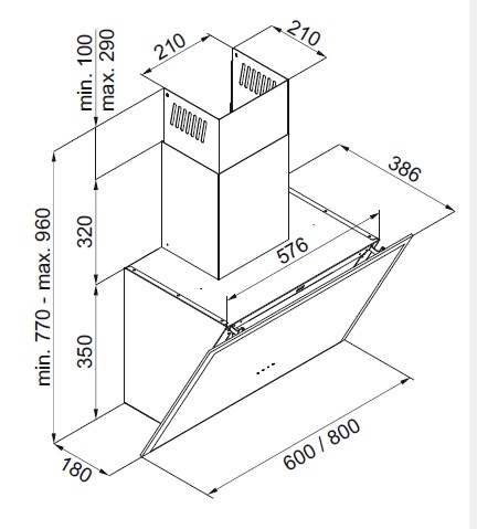 Väggmonterad köksfläkt, vertikal. Med inbyggd motor - Svart / svart glas - 800mm - A+