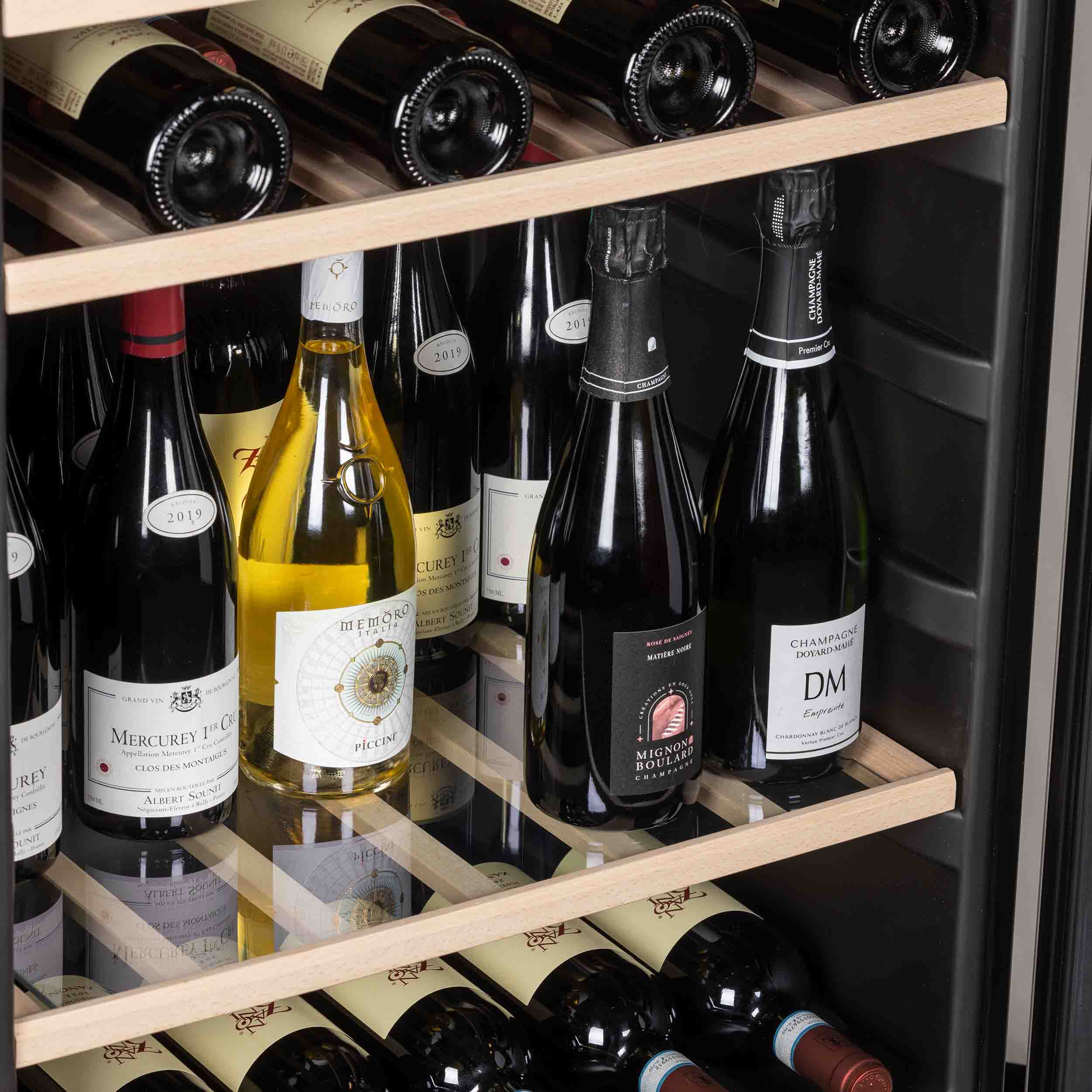 Glashyllan stabiliserer bottenhyllan. Här kan du välja att vinflaskorna placeras stående