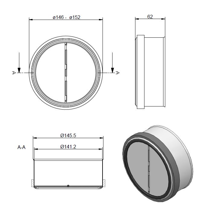 Vertikal återströmningsventil Ø150 i stål – hindrar kall luft från att komma in.