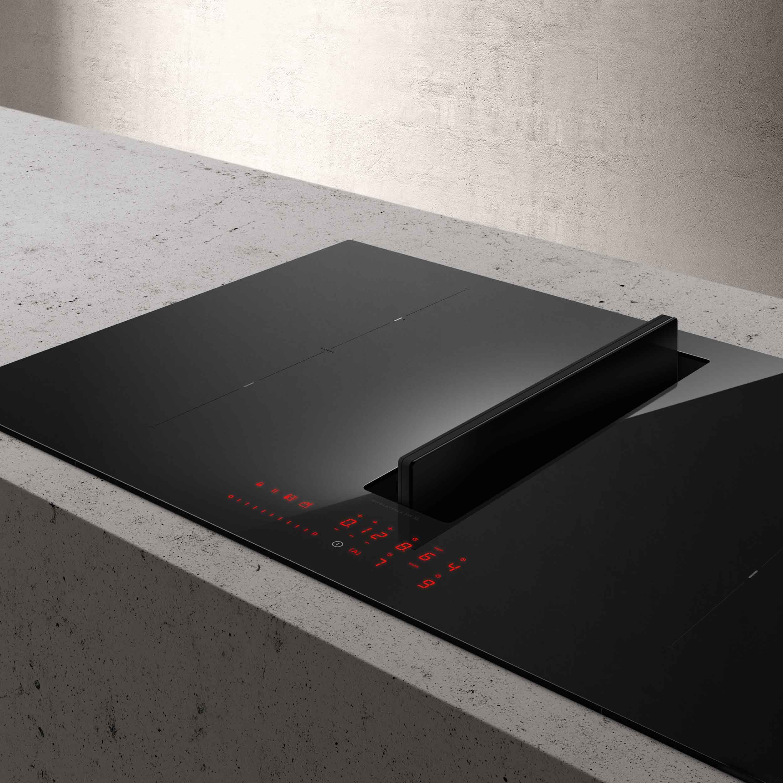 2 kokzoner: 21 x 19cm / 2.100 W (3.000 W) + 2 kokzoner: 21 x 19cm / 1.650 W (1.850 W). Denna modell levereras utan rörpaket. Hällen har rundade hörn och man kan välja att installera den, antingen ovanpåliggande eller planmonterad. Den intelligenta styrningen justerar sugstyrkan, beroende på hur många av hällens zoner som är igång och på vilken nivå de är inställda på.