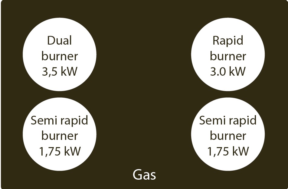 1 kokzone: Dual / 3.500 W + 1 kokzone: Rapid / 3.000 W + 2 kokzoner: Semi rapid / 1.750 W. Denna modell levereras komplett med standard rörpaket och tejp för att täta rörskarvarna till golvhöjd. Minsta gryt eller pannstorlek på bakre kokzoner är 20cm. Minsta gryt eller pannstorlek på främre kokzoner är 14cm Det medföljer dysor för naturgas och flaskgas. Dysor till naturgas monteras på fabriken.