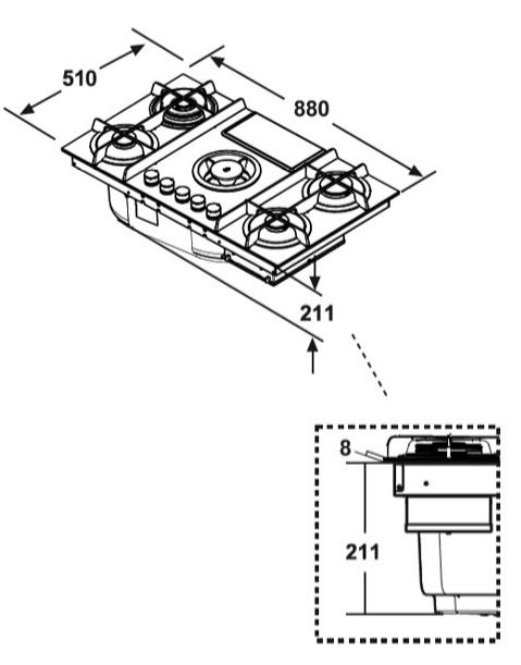 Gashäll med inbyggd fläkt och dubbelbrännare. 5,1 m/s luftflöde och låg ljudnivå 63 dB(A) vid max. effekt.