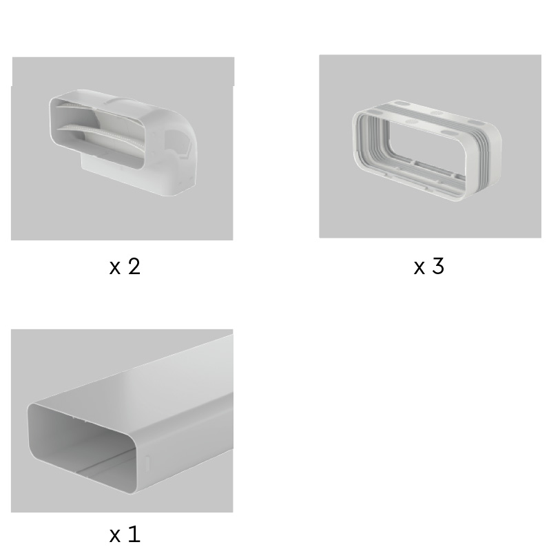 Rörpaket Prime 2 – Komplett lösning ner till golvnivå och ut. Inga extra delar krävs. Paketet passar alla modeller av häll med integrerad fläkt, med 90x220 mm anslutning.