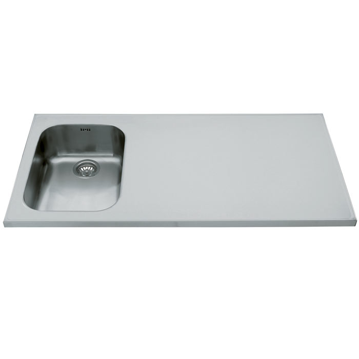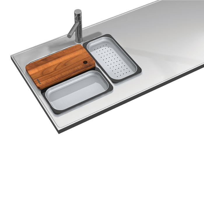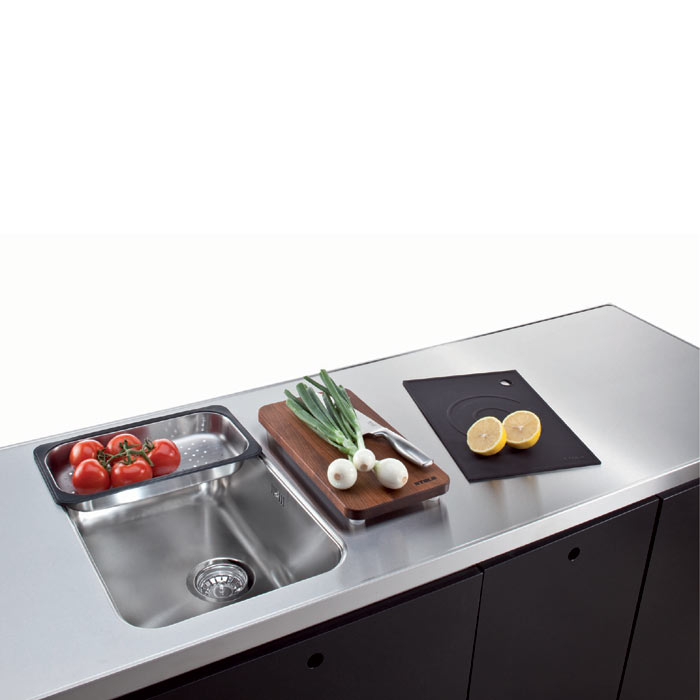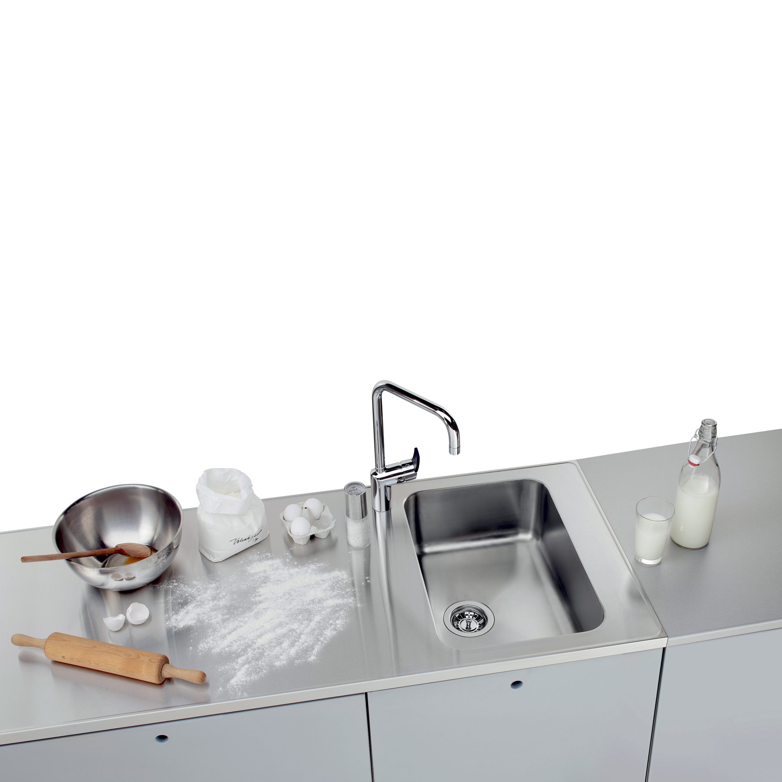 Seven E, Bänkskiva med diskho. Bänkskiva med enkel diskho Längd - specialanpassning av mått med 5 mm intervall. Plan eller upphöjd kantprofil. Ytan är som standard slät. Dekormönster beställs som extra utrustning. Korgventil kan beställas. Stålbakkant kan levereras för montering. Kanten är 58 mm höjd. Hål för blandare kan beställas