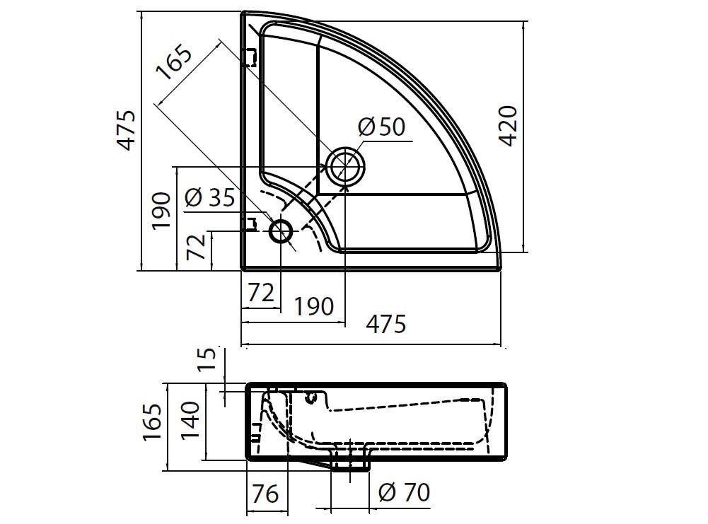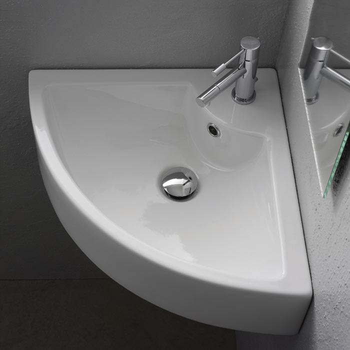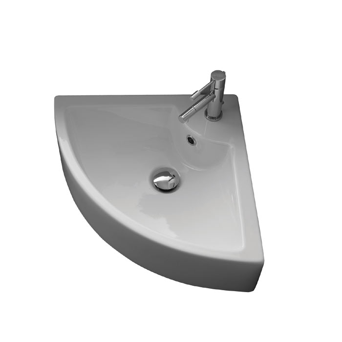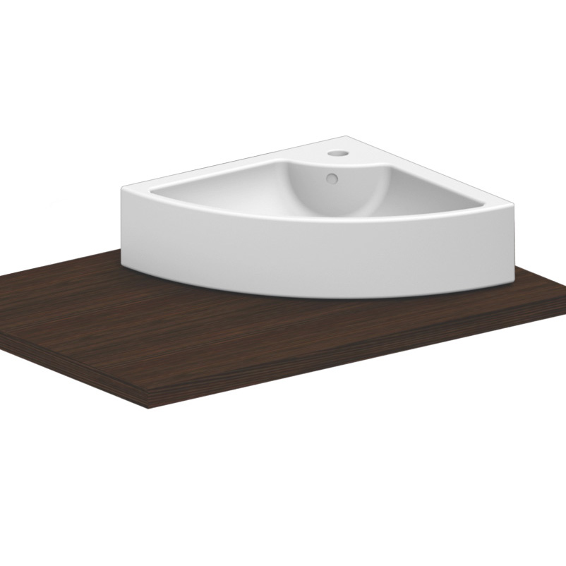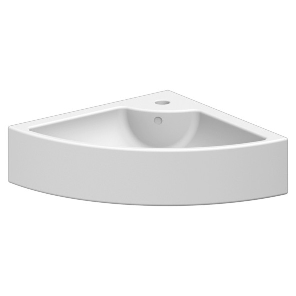 Hörnvask i porslin. För montering på skiva eller på vägg. Med breddavlopp. Enkelt tvättställ. NB: Tag kontakt för att få ritning för utskärning. Då materialet är porslin kan måtten variera. Därför rekomenderas det alltid, att produkten är fysiskt närvarande.