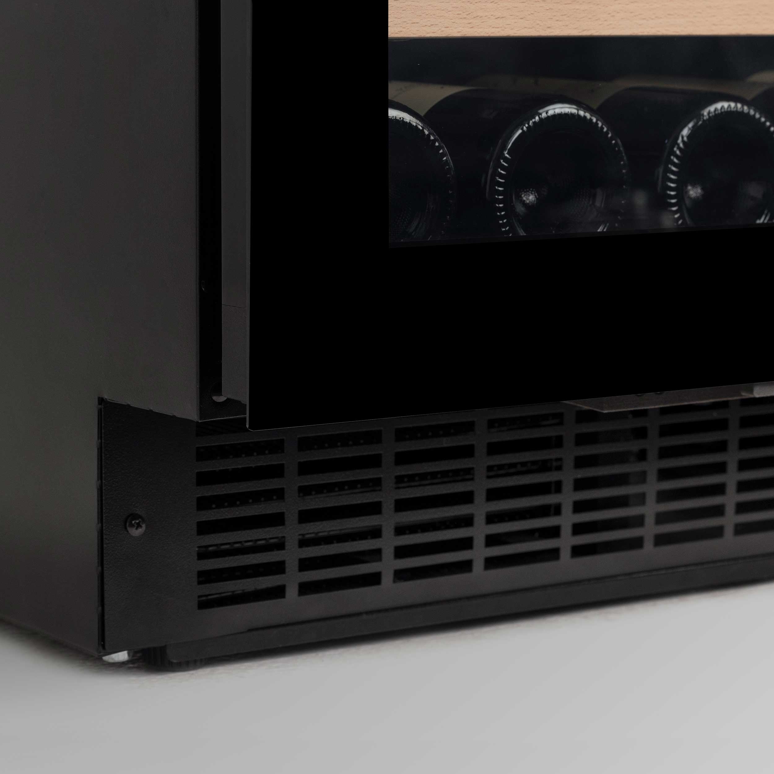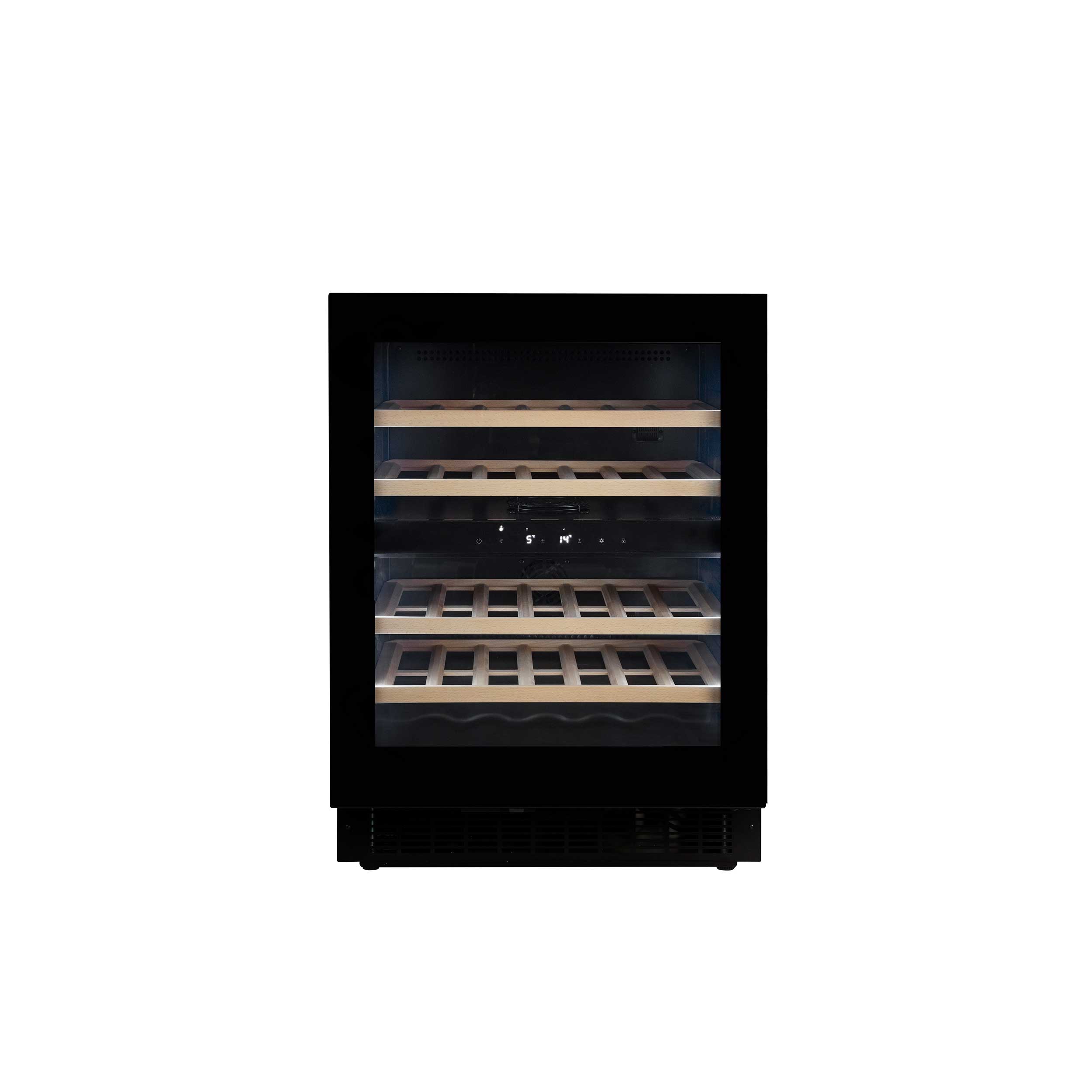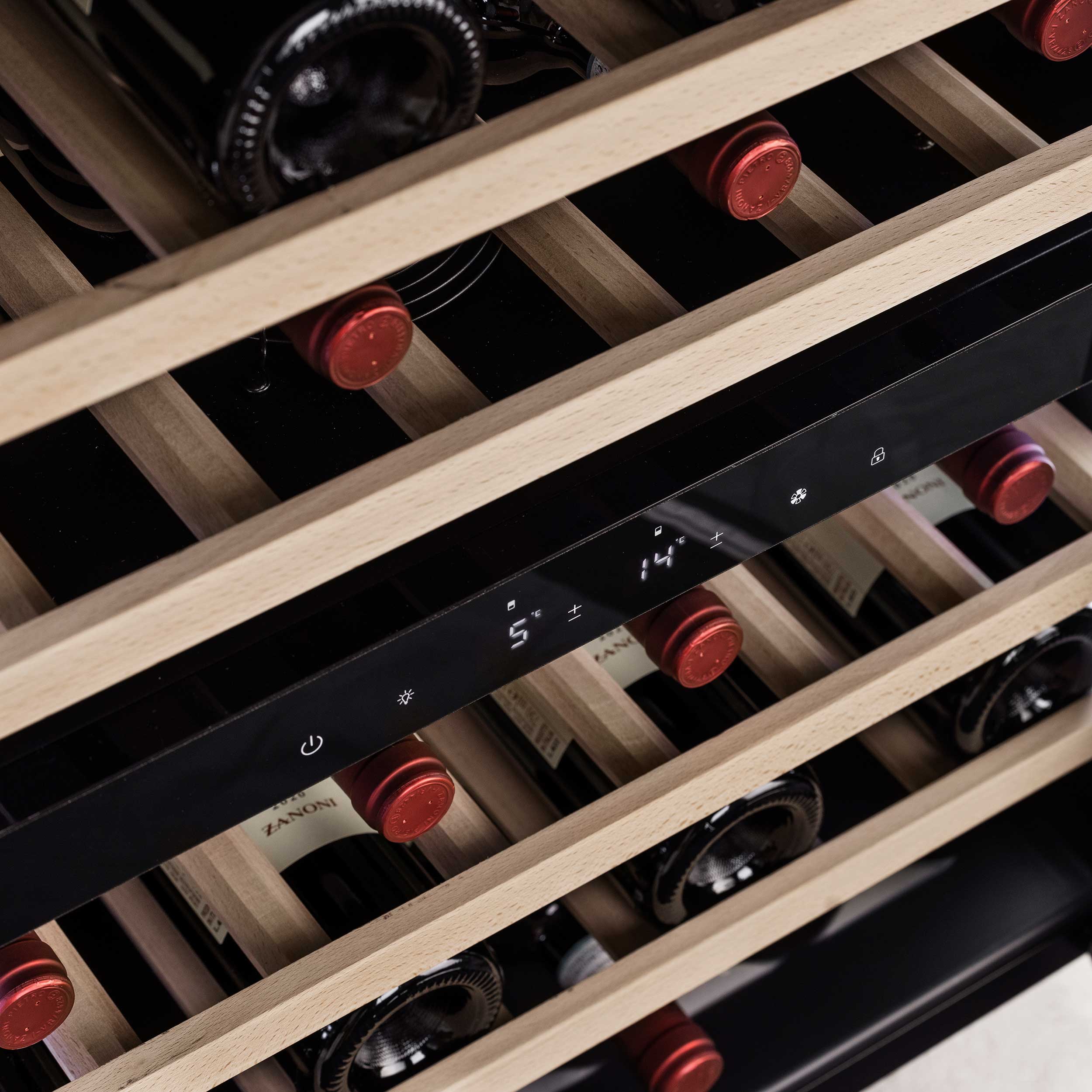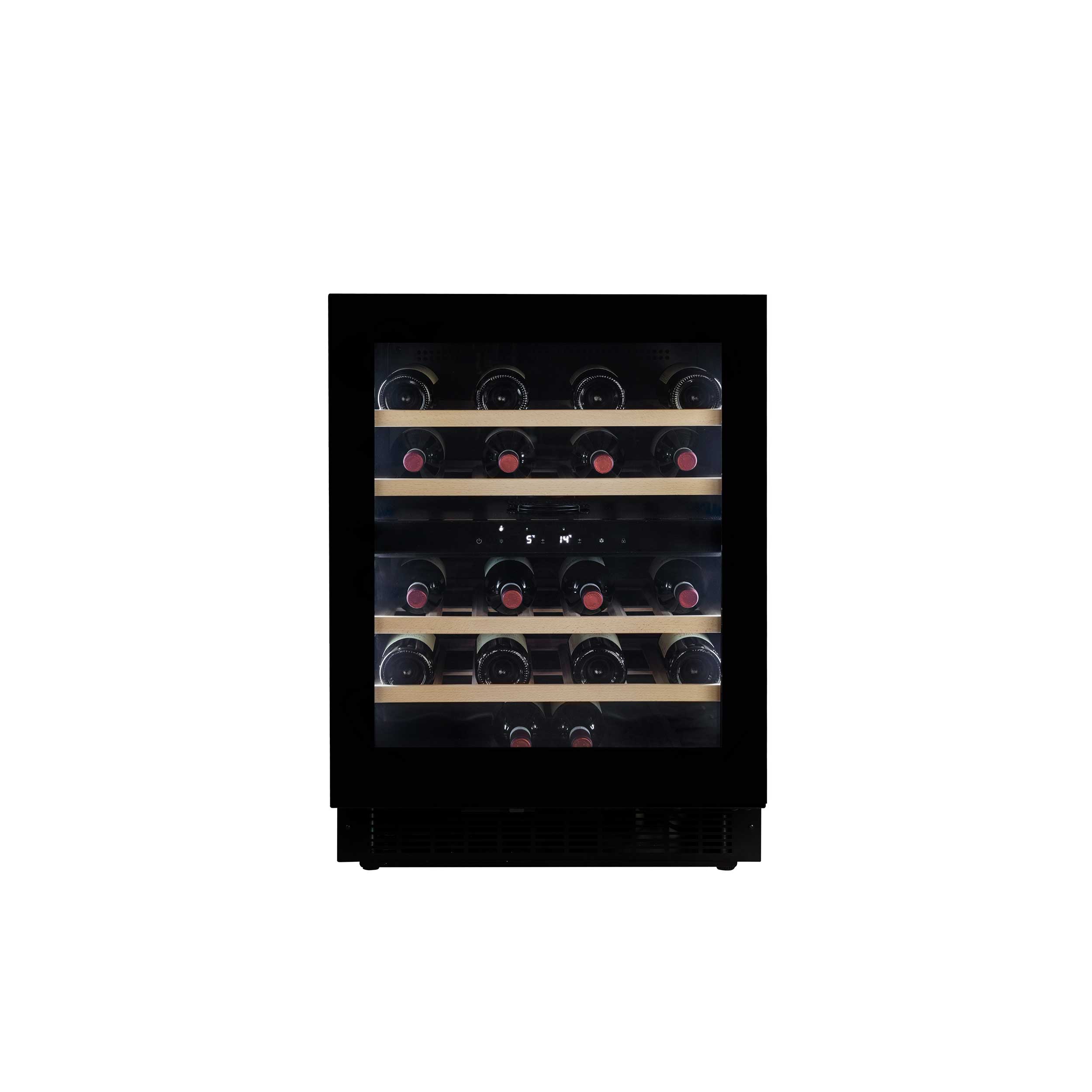 Vinkylskåpets fläkt (vanligtvis på större skåp) säkrar att den kalla luften cirkuleras runt i zonen och kylningen med kompressorteknologi säkrar en konstant och jämn temperatur.